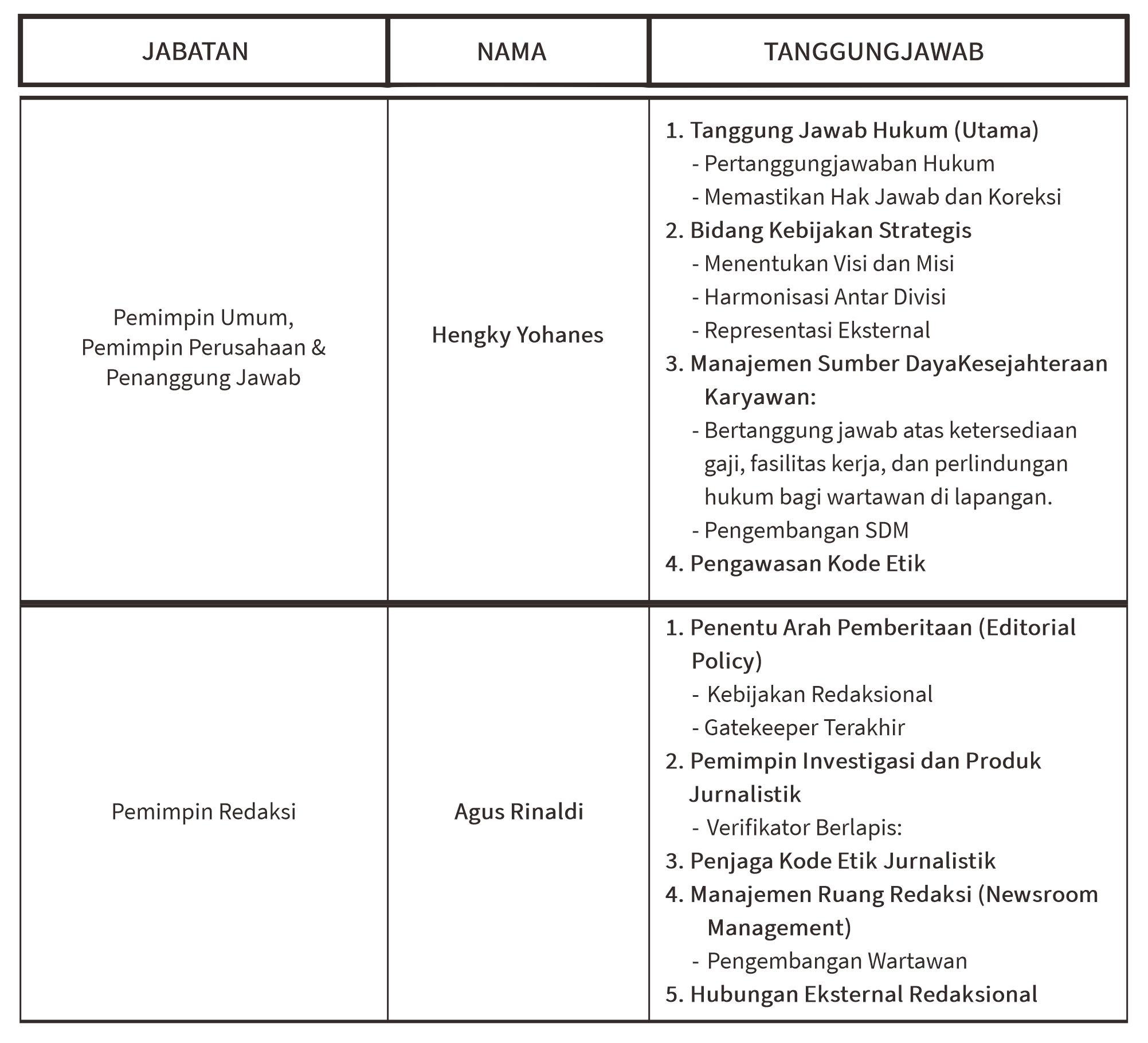 - Menjaga independensi dan non-partisan dari kepentingan politik maupun bisnis yang dapat mengganggu integritas newsroom.